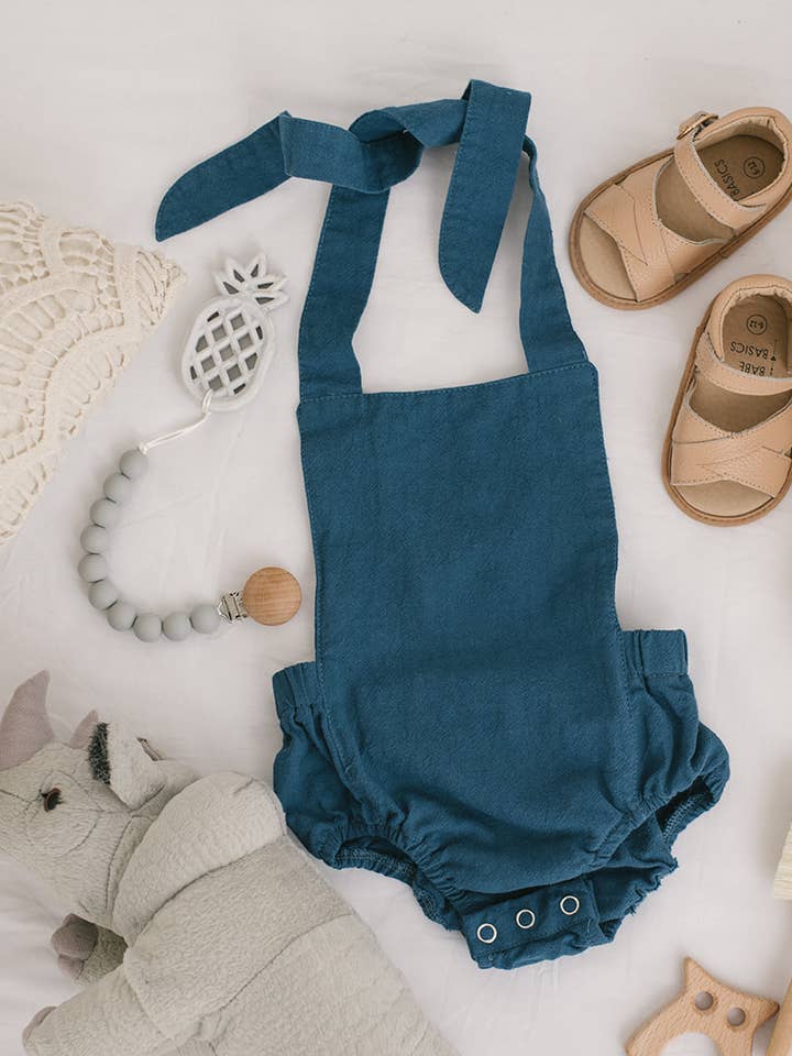 Adorable baby romper crafted with linen/cotton blend fabric using non-toxic dyes. Your little one stays comfortable and cool, while you get the ease of diaper snaps and stretch material.